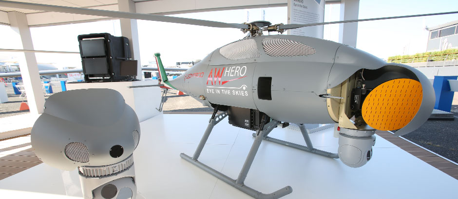 The AWHERO, on display at the 2017 International Paris Air Show, is equipped with a Gabbiano Ultra-Light Radar and an EO/IR sensor.