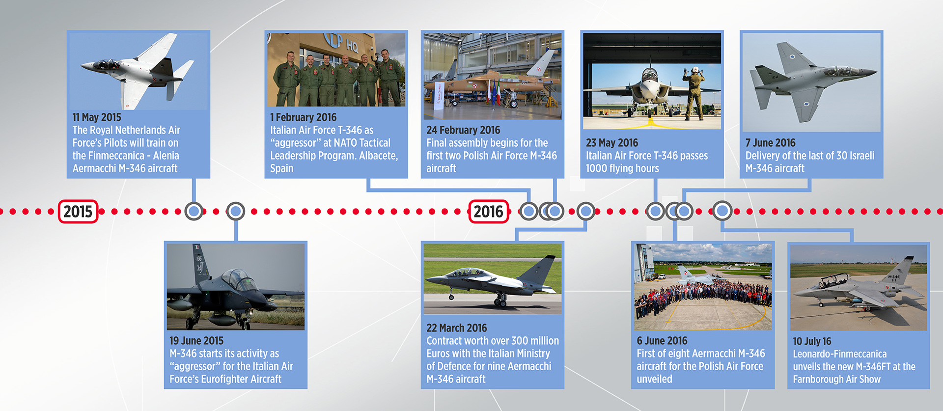 In February 2014, a contract was signed with the Ministry of Defence of Poland to supply 8 M-346 aircraft plus logistics support, a training programme for pilots and engineers and a Ground Based Training System with dedicated classrooms and educational material. The first aircraft for Poland has just made its first flight test before its final acceptance by the customer.
