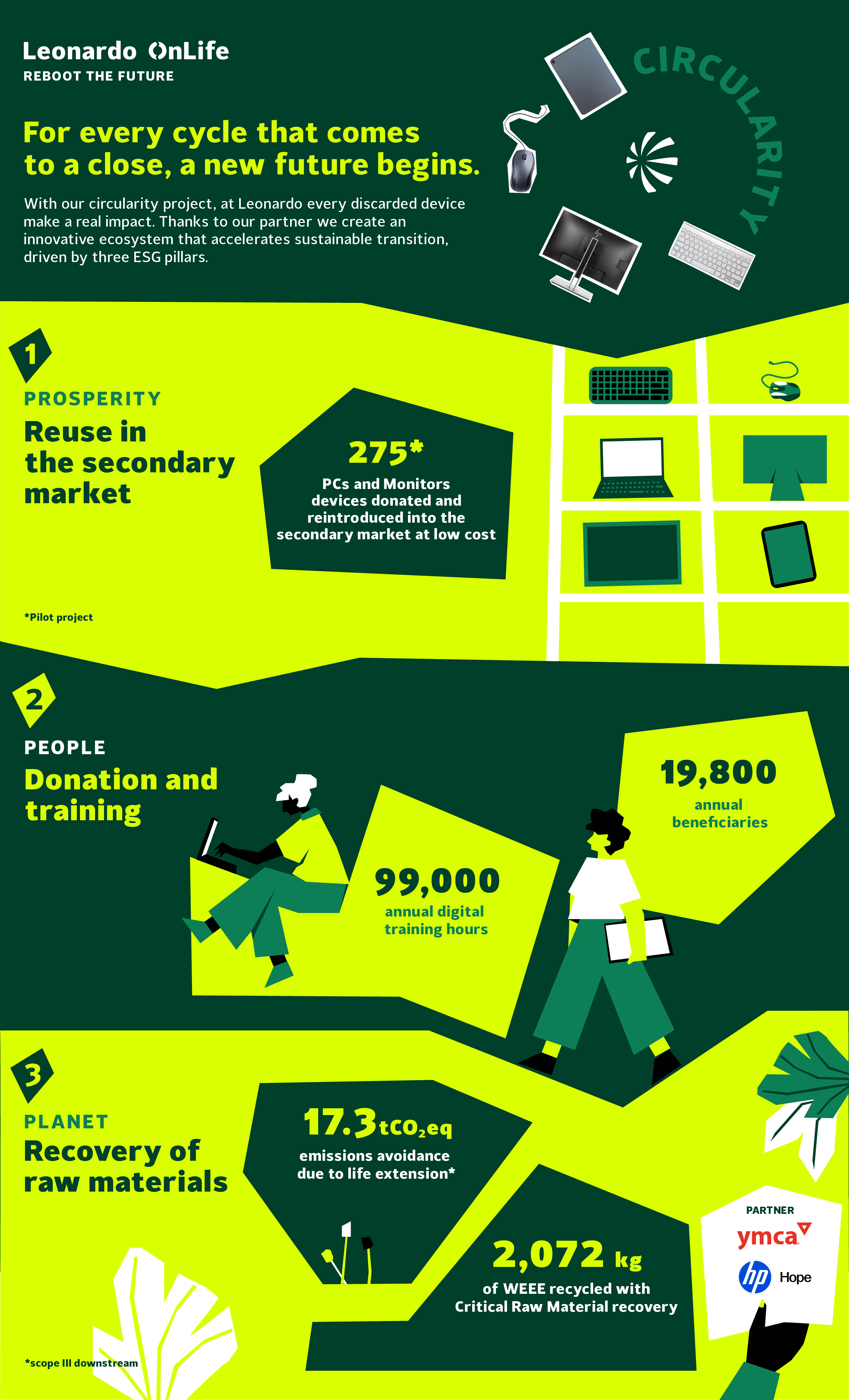 Extending the life cycle of digital devices and maximising the value of each component: this is the goal of the OnLife project, developed by Leonardo, which introduces a circular economy model applied to workplace assets. The initiative, which stems from a collaboration between Leonardo's Sustainability and Digital Solutions departments, integrates digital technologies – from automation to artificial intelligence – with circular processes that reduce consumption, emissions and the use of raw materials, while generating social value for the communities in which the Group operates. The aim is to transform the traditional process of managing discarded PCs and monitors into a concrete opportunity f structured around three main drivers.