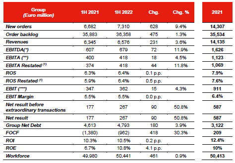 - EBITA, amounted to EUR 418 million, essentially recorded the same growth as noted in Revenues (+5%), with the GIE ATR zeroing out the negative performance reported in the previous six-month period. The figure for the current period also includes costs associated with the COVID-19 emergency, which vice versa had been classified as non-recurring charges in the first half of 2021. The growth in the first half of 2022 in relation to the Restated figure for the first half of 2021 to take account of these charges (€mil.374, with a Restated ROS of 5.9%) shows an improvement of 12%, equal to 0.5 p.p. of ROS