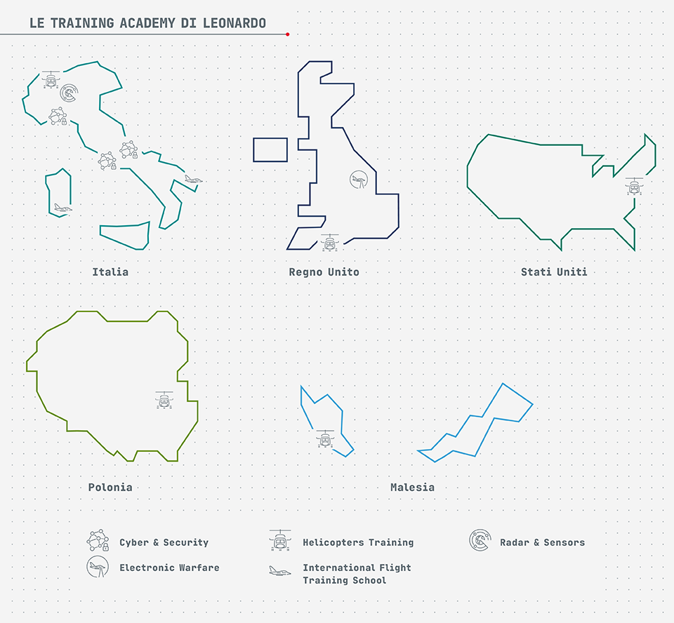 Infine, mettendo a fattor comune le competenze addestrative nel settore dell’ala fissa e rotante, Leonardo è in grado di erogare l’intera gamma dei servizi di formazione per la manutenzione di aerei, elicotteri e velivoli a pilotaggio remoto, oltre che dei relativi sistemi, in ambito civile e militare. La formazione, rivolta alle risorse interne e agli end-user dei sistemi e delle piattaforme di Leonardo, opera secondo le normative europee in campo militare (EMAR - European Military Airworthiness Requirements) e civile (EASA - European Aviation Safety Agency), rispettando gli standard più moderni in materia di ciclo di vita dei prodotti (gli S-Series emessi dalla ASD - Aerospace, Security and Defence Industry Association of Europe).