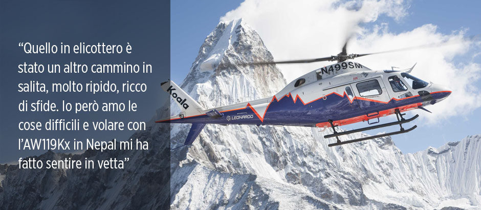 I sogni vanno inseguiti e bisogna mettersi in cammino se si vogliono realizzare. Il percorso intrapreso 35 anni fa nel mondo dell’alpinismo è stato lungo ed entusiasmante e mi ha regalato un’esistenza ed una vita felice e intensa. Quello in elicottero è stato un altro cammino in salita, molto ripido, ricco di sfide. Io però amo le cose difficili e trovarsi a volare con l’AW119Kx in Nepal, ai comandi di questo mezzo assieme al Comandante Ezio Oliva, mi ha fatto sentire “in vetta”: ammiravo il paesaggio e guardavo in basso...