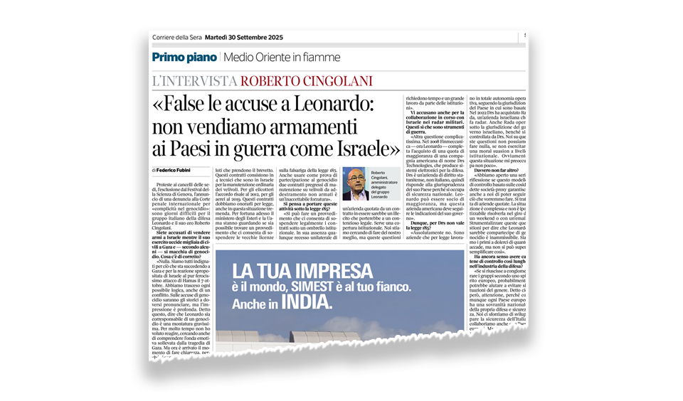 Roberto Cingolani, Amministratore Delegato e Direttore Generale di Leonardo, intervistato da Federico Fubini sul Corriere della Sera, respinge le accuse di vendita di armamenti a Israele e di complicità nel conflitto a Gaza, sottolineando che l'azienda non ha autorizzato esportazioni verso Israele dallo scoppio del conflitto.