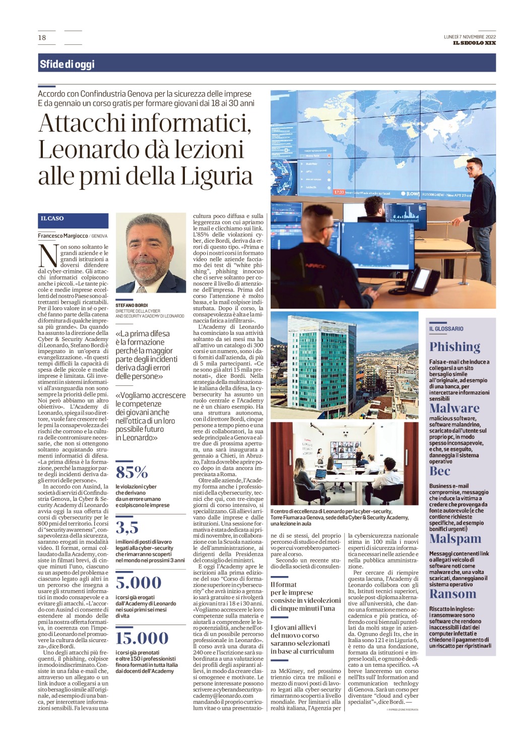 Proprio in questo senso vanno lette le due nuove iniziative che vedono al centro la Cyber & Security Academy di Leonardo, l’accordo con Ausind società di servizi di Confindustria Genova, per offrire corsi di cyber security alle oltre 800 PMI associate e l’apertura delle iscrizioni alla prima edizione del “Corso di formazione superiore in Cybersecurity” totalmente gratuito, rivolto ai giovani dai 18 ai 30, che avrà inizio a gennaio 2023 e sarà svolto dall’Academy di Leonardo.