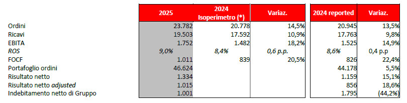 (*) Al fine di rendere maggiormente confrontabile l’andamento gestionale del Gruppo, gli indicatori di performance dell’esercizio comparativo e la relativa variazione sono stati rideterminati per escludere il contributo del business UAS, oggetto di cessione all’inizio del 2025 (isoperimetro).