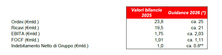 Sulla base delle correnti valutazioni degli impatti della situazione geopolitica sulla supply chain, sui livelli inflattivi e sull’economia globale, fatti salvi eventuali ulteriori significativi effetti, Leonardo prevede di conseguire nel 2026 i seguenti risultati: