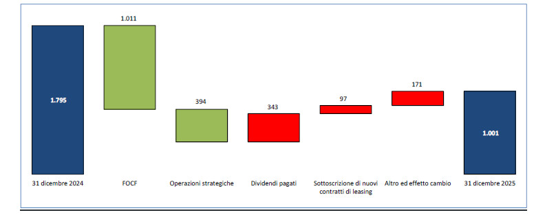 Il FOCF pari a € 1.011 mil., in crescita del 22,4% rispetto al dato 2024 di € 826 mil., conferma i risultati positivi raggiunti grazie alle iniziative di rafforzamento della performance operativa e della gestione del capitale circolante. L’andamento del FOCF e il corrispettivo ricevuto nell’ambito della cessione del business UAS, pari a circa € 446 mil., determinano un conseguente riflesso positivo sull’Indebitamento Netto di Gruppo, in calo del 44,2% circa rispetto al 31 dicembre 2024.