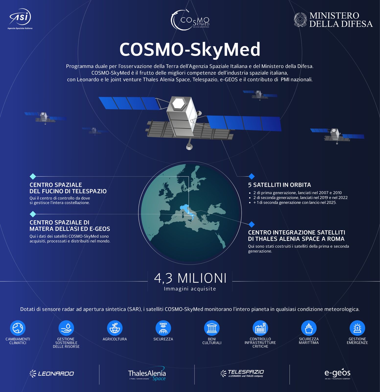 COSMO-SkyMed (Costellazione di Satelliti per l’Osservazione del bacino del Mediterraneo) è una costellazione per l’Osservazione della Terra ad uso duale, di proprietà dell’Agenzia Spaziale Italiana (ASI) e del Ministero della Difesa. Per lo sviluppo della costellazione l’industria italiana svolge un ruolo di primo piano, con Leonardo e le joint venture Thales Alenia Space e Telespazio, insieme a un significativo numero di piccole e medie imprese.