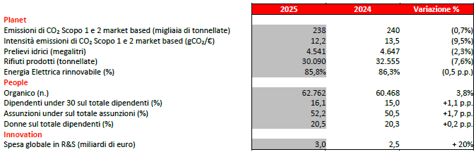 Nel 2025, l’organico è incrementato di 2.294 risorse rispetto al 2024, con una crescita registrata prevalentemente in Italia (circa +1.600) e Regno Unito (circa +400). Nel corso dell’esercizio sono state effettuate oltre 6.600 assunzioni. I dipendenti under 30 rappresentano circa il 16% del totale (+1,1 p.p. rispetto al 2024), confermando il trend positivo degli ultimi anni in termini di mix generazionale e rafforzamento delle competenze nel Gruppo.